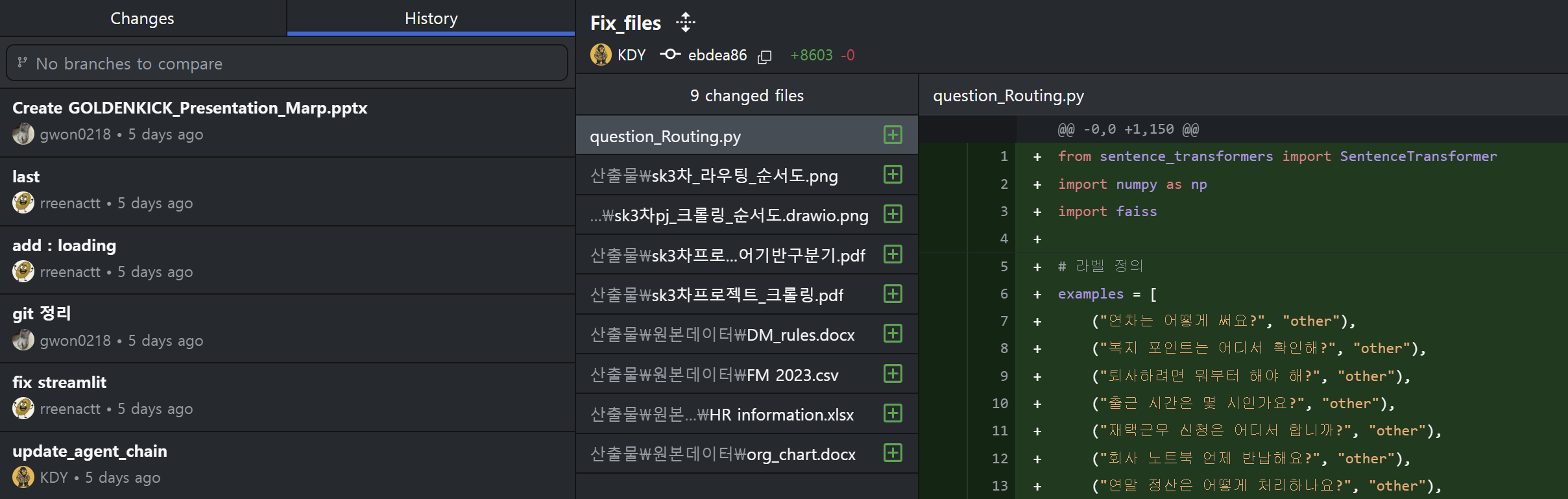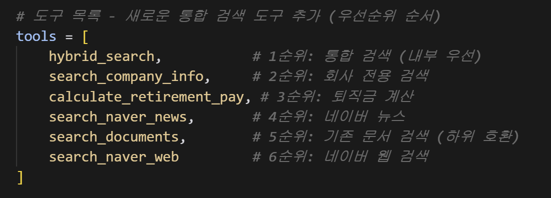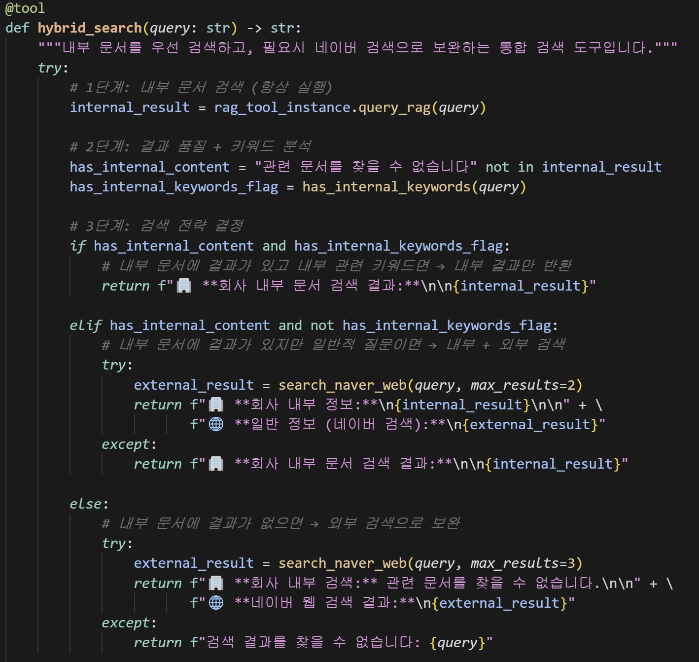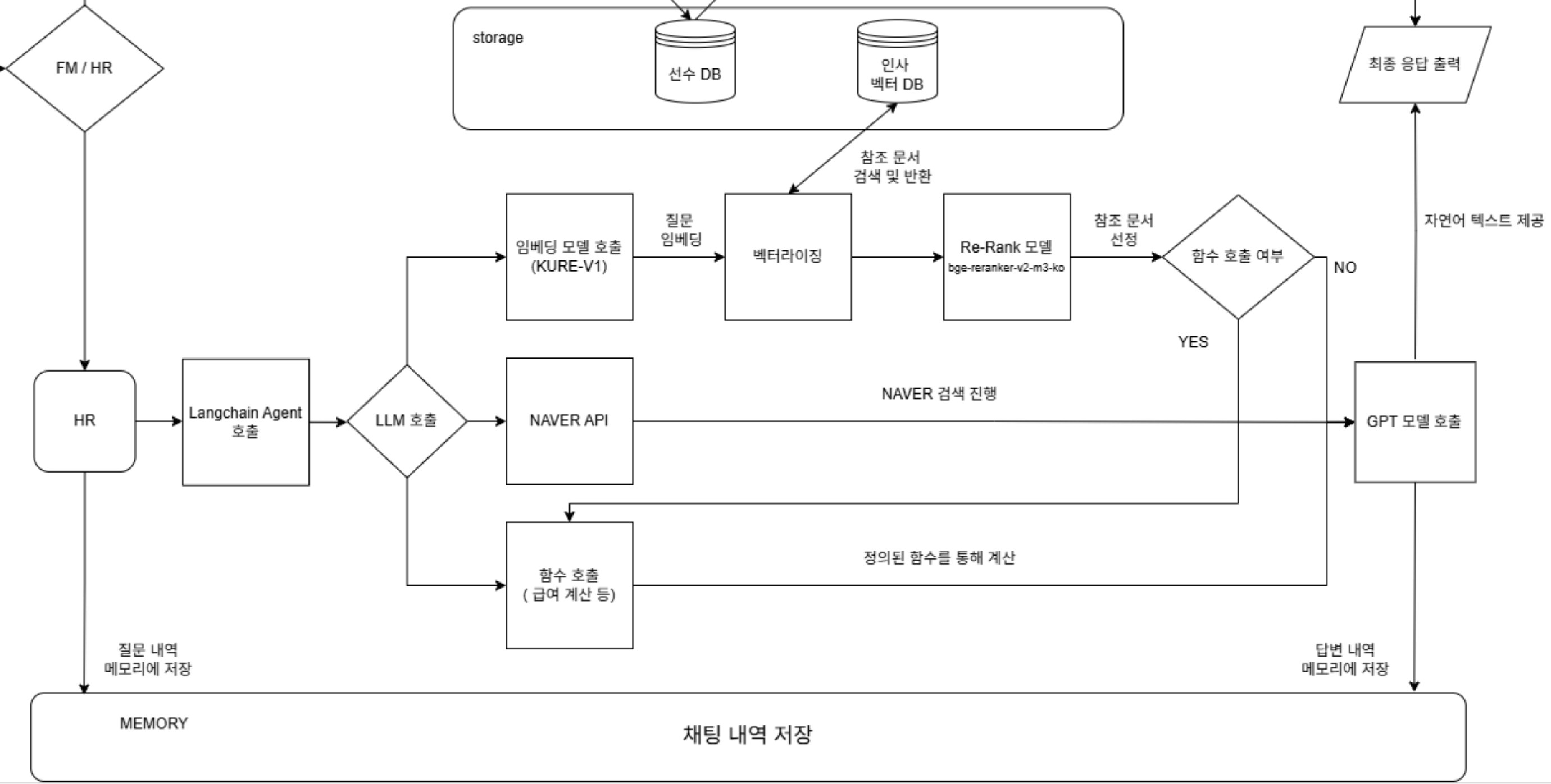 다양한 데이터와 수업에서 배운내용을 모두 적용해보기로 했고 각자 맡은 부분에서 계획보다 더 높은 성과를 내서 빠르게 합치고 발표까지 빠듯한 일정이었지만, 결국 계획대로 제작했다. 내가 담당했던 RAG 시스템은 이 3가지 복합적인 데이터를 벡터DB로 임베딩 하고 사용자가 자연어로 질문을 하면 llm이 벡터DB에서 검색해서 답변을 만들어 주는 단순한 형태를 보다 발전시켰다. 사용자 질문이 분류기를 통해 내부분서 HR모듈로 전달이 되면 langchain agent에서 시작하도록 구성하였다. langchain agent는 llm을 호출하여 다시 질문에 따라 3가지가 순차적으로 작동하는 hybrid search 방식으로 구성하였다. 먼저 내부분서에 해당되는 정보일 경우에는 벡터DB에 접속해서 내부문서에 해당되는 답을 주고, 그게 아닐경우에는 미리 연동해둔 네이버 api를 통해 네이버 검색결과와 출처를 보여주게 설정하였다. 그리고 function calling 기능도 추가하여 계산식이 필요할 경우에 @tool에서 필요한 함수를 호출하여 추론이 아닌 정해진 계산식에 맞춰 계산하도록 하였다. 환각현상을 줄이고 정확도를 높히기 위해 리랭커 모델도 추가하였다. 답변시 내부문서인 벡터DB에서 답변 메세지를 만들때에 임베딩모델이 먼저 10개의 유사한 문장을 찾고 이후에 바로 llm으로 전달하는것이 아닌 다시 리랭커 모델이 3개로 추려서 llm에 전달하도록 하였고 정확도가 많이 향상되었다.