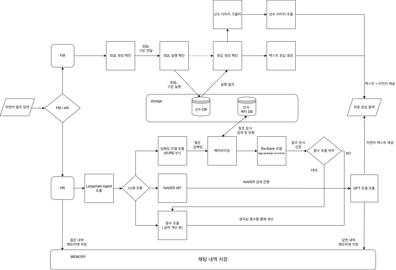 내부문서 검색시에 내부문서가 아닐경우에는 연동된 네이버api와 연동해서 답변을 얻도록 설정했다. 처음 제작부터 각각의 파일을 모듈화해서 확장성을 가질려고 계획했다. langchain만을 바꿀려면 agent파일만 수정하면되고 벡터 db추가는 data폴더에 추가, 기능추가는 tool에 계속 추가하면 되도록 구성했다. 벡터db는 2가지로 나누어서 작업하였다. 먼저 복합데이터인 내부문서는 기존의 데이터를 먼저 청크하기 좋게 필요없는 내용 ( 목차, 의미없는 기호 )을 제거하고 청크를 진행 후에 정확도를 더 높히기 위해 청크보완을 진행하였고, 검색시 중요내용이 누락되지 않도록 슬라이딩윈도우 방식으로 하였다. 슬라이딩 윈도우 방식은 조단위로 나눈걸 3개씩 겹치도록 구성하였다. 내부규정은 답변처리 속도보다 누락없이 내용이 정확하고 환각현상이 발생하지 않는 것이 중요하기 때문에 이 방식으로 청크보완 하였다. 인사정보는 기존의 인사정보와 조직도를 매칭하여 청킹하였다. 이후 임베딩은 kure-v1이라는 bge-m3를 고려대학교에서 한국어 성능을 더 향상시켜 튜닝한 모델을 사용하였다. 정확도를 더 높히고 환각현상을 줄이기 위해서 프롬프트도 여러가지로 테스트 해봤다. 역시 프롬프트 마다도 성능이 다 달랐고 금지형 프롬프트가 가장 점수가 높았다. 답변 생성시에도 리랭커 모델을 추가하였다. 임베딩모델이 벡터DB에서 답변을 10개를 가져오면 리랭커 모델이 다시 상위3개로 요약해서 llm에 전달하도록 했고, 추후 점수나 정확도 테스트에서도 20%이상 향상되는 결과를 보여줬다. 리랭커 모델은 bge-reranker-ko모델로 임베딩 모델고 같은 bge 계열이고, 다시 한국어정확도를 높힌 모델이다.